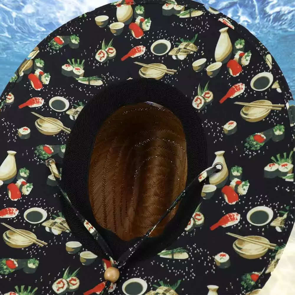 Keep your fish fresh with the Sushi Straw Hat with your Tuna on ice. This yellowfin rears its tail out of this ice bucket with a sushi pattern on the brim with saki. Get the right sun protection with the Sushi straw hat for your next fishing trip.