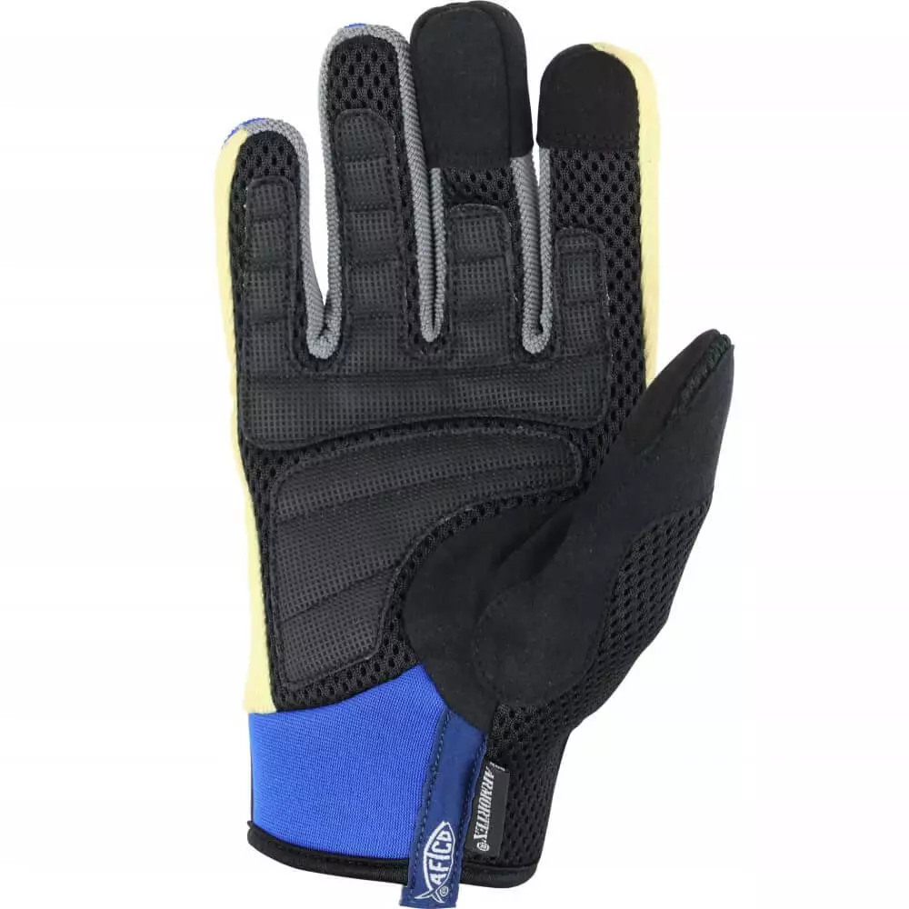 “Aftco Blue Release Gloves. AFTCO Release fishing gloves are the ideal saltwater fishing glove for leadering line, grabbing the bill of a marlin, or just getting a grip on anything slippery. These are the pair of gloves you want for offshore fishing. Extra tacky Diamond-Grip polyurethane is directly injected onto nylon mesh palms for improved grip in wet conditions. Super tough Armortex® along outer hand and reinforced index finger maximizes protection when wrapping leader on a big fish offshore. The gloves vented foam-backed mesh keeps hands cool and protected, while Spandura® forchettes improve dexterity. Perforated neoprene cuff with Velcro® closure assures a secure fishing glove fit.