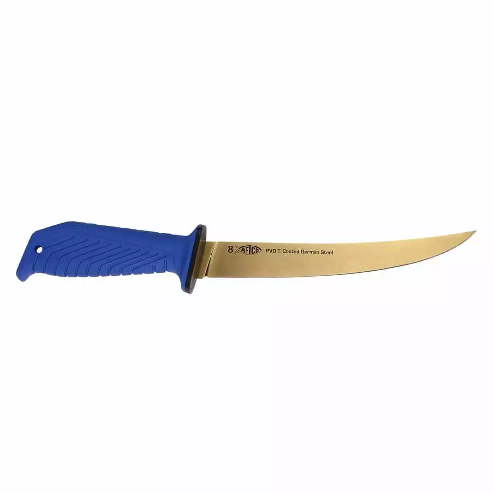 AFTCO’s new 8″, 10″ and 12″ fish fillet knives are built in collaboration with Böker Germany to deliver premium blade options for gamefish processing of all sizes. The range of AFTCO fillet knives feature 4116 German stainless steel blades with a full tang construction and up sweep design. The premium Böker blades are easily distinguished with an AFTCO gold TiN finish that is bonded to the blade through PVD ensuring durable corrosion resistance. A sub-zero quench process helps maintain blade sharpness and edge retention. The handle features an over-molded slip-free polypropylene / TPR surface that is both anatomically and ergonomically correct for optimum in-hand feel. From Walleye to Wahoo, AFTCO’s fillet knives will provide the right tools to get the job done.