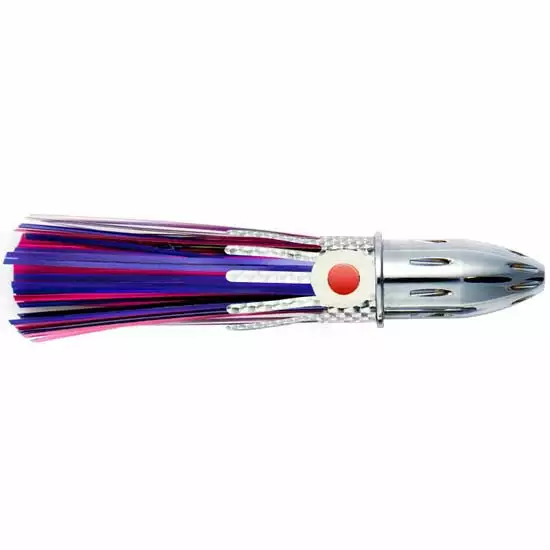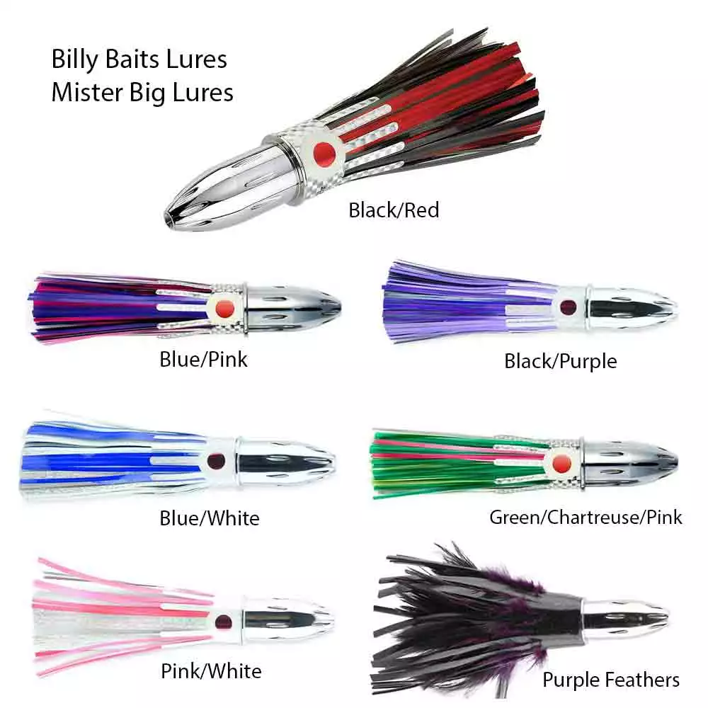 Prop 65 Warning CAThe Mr. Big lure was designed by Billy Baits for high speed trolling. Troll the Mr. Big lure from 8-20 knots to witness the enormous smoke trail created by the 8 machine drilled vent holes in its 16 oz head. The trolling action and the internal stainless rattle make the Mr. Big lure a Wahoo’s worst nightmare because they can’t resist it. 9 inches long.