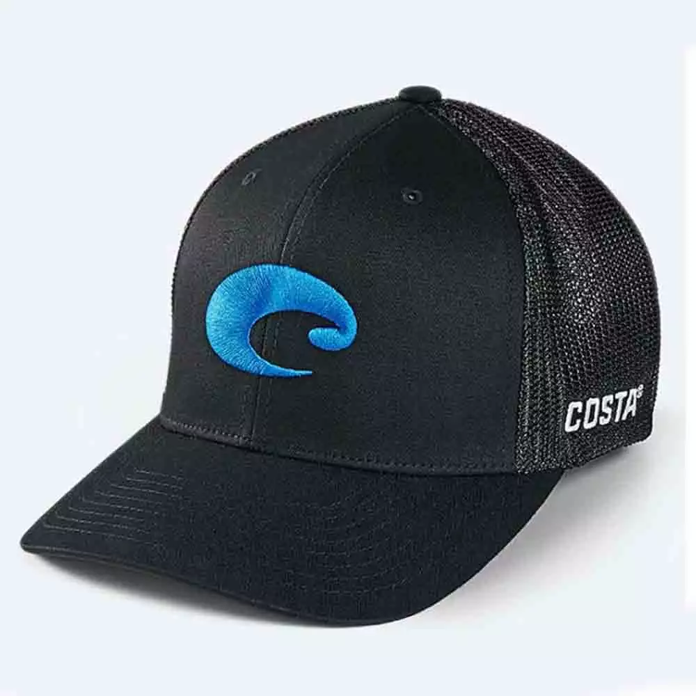 Costa Logo Flex Fit Black Trucker Hat features a structured front with six-panel construction. HA 140BLK.
