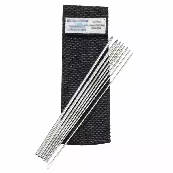 Prop 65 Warning CAQuick Shot Needles in a convenient pouch, 7 needles and 1 threading needle for splicing and making top shots & wind-on’s, from 30lb – 550lb.