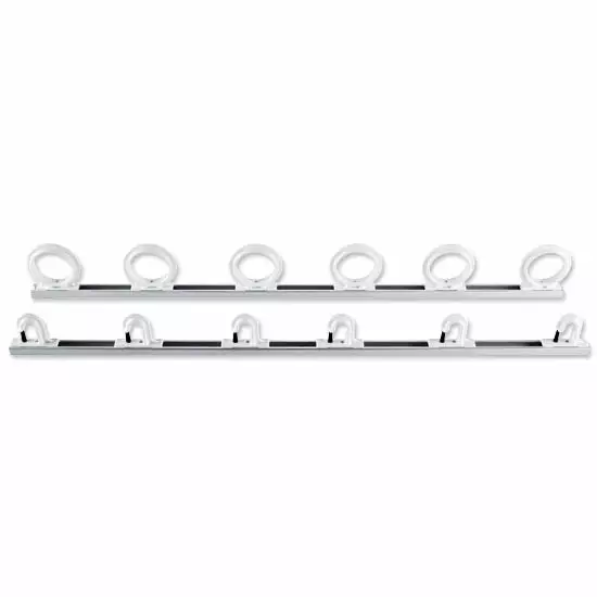 Prop 65 Warning CAThe Trac-A-Rod storing system mounts on the ceiling or wall, vertical or horizontal. Stores up to six rods with rod handles up to 1 3/4″ in diameter. The rod holders are adjustable and come with 2-foot trac section made of anodized aluminum. Srew mount holders mount with #8 size sheet metal or wood screw (not included). White/Silver.