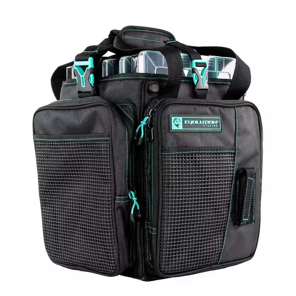 With its open top feature and extremely rugged wear-resistant 1680D construction, the Evolution Outdoor 3700 Vertical Drift Series Topless Tackle Bag delivers the quality and functionality that Evolution Fishing is known for. These Drift Series Tackle Bags have an innovative large mouth, open top feature that provides quick and easy access to all your trays. Slide your trays in vertically with this version of the tackle bag. The integrated tie down Y-Strap will secure your trays in the bag, and in case of stormy weather, these bags are equipped with an integrated rain fly that you can zip up and store away when not in use. With 3 large exterior storage pockets and 4 rubber mesh slip pockets, you’ll have plenty of room to store all your accessories. It’s also equipped with a plier holster, side pocket line spool feed, and a non-slip, waterproof bottom with integrated drainage grommets. Transporting these tackle bags will be a breeze with the adjustable, removable shoulder strap and the padded top carry handle. With the capacity to hold up to 5 tackle trays, it’s more than capable of holding all your fishing essentials. Each tackle bag will include 5 matching color Drift Series Tackle Trays.