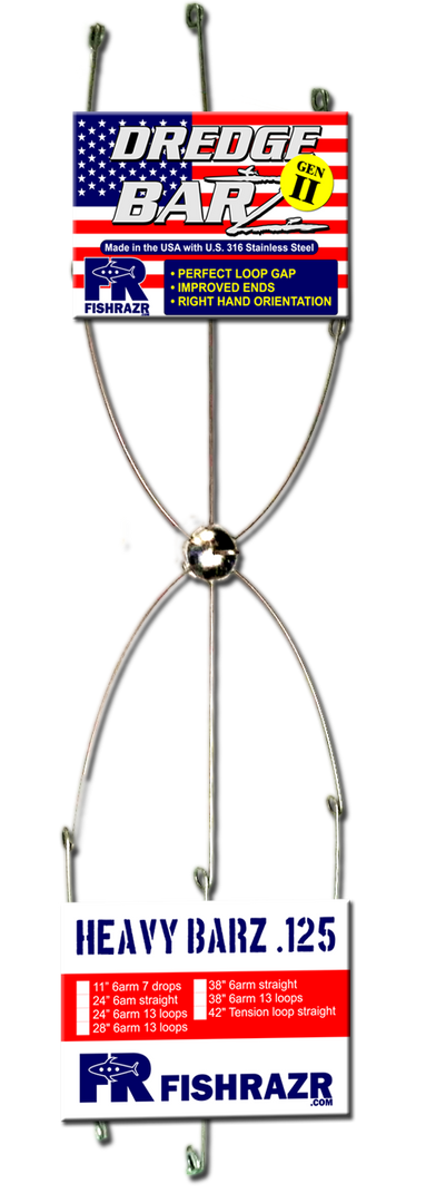 The generation II dredge bar by Fish Razr is the go-to tournament series dredge bar. The 6 arm bars are available in 28” and 38” lengths. The generation II bars feature improved arm loops with increased gap between the loops and arms for easier swivel application. The arms also are now right-hand orientation and have improved downward ends that still allow room to stage a swivel for application. All Fish Razr dredge bars are made of US 316 stainless steel, .125” diameter, precession bends, and super strong metal allow center hubs. This super strong bar will give you plenty of fishing time.