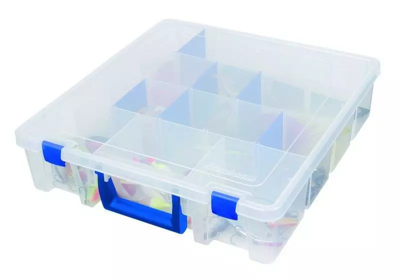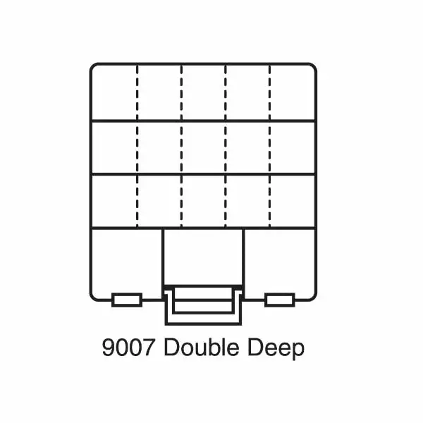 Prop 65 Warning CATuff Tainer 9007 Double Deep Satchel Divided with Handle. Multi-purpose, see-through utility boxes, with durable latches, interchangeable compartments and “Zerust” dividers. Zerust protects your tackle against rust. The 9007 is designed with large deep bulk storage for larger accessories like spare reels, flashlights, smaller electronics, flares, bulk spools fishing line and smaller bait boxes. Has an easy carry handle with recessed latched. 18 Compartments with 12 Zerust dividers. *Tackle in boxes not included.* 15″ L x 14″ W x 3.5″ D