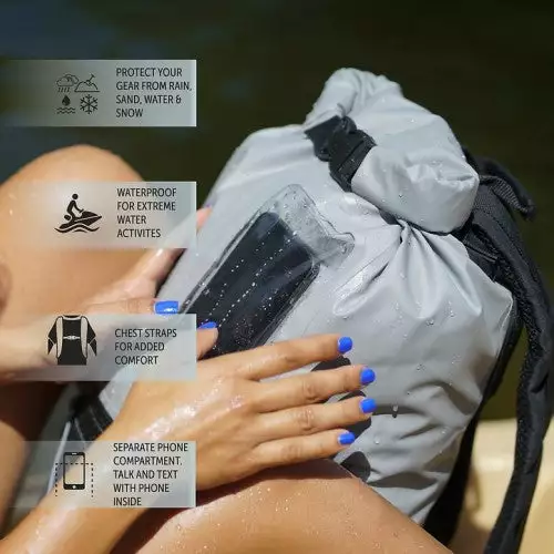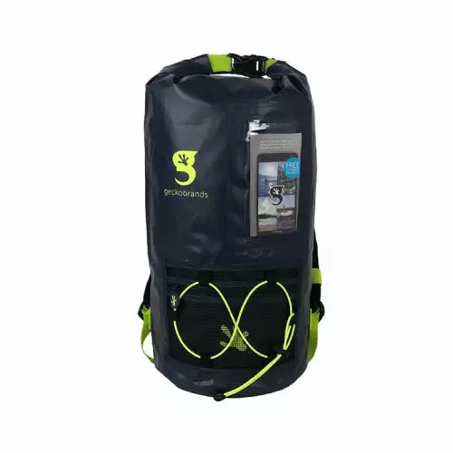 Gecko Hydroner 20L Waterproof Backpack. This backpack features a 20L capacity, durable pvc tarpaulin material and a sleeve to store and still use your phone. Have easy access to gear with the outside mesh zip pocket and bungee cords. 20L capacity. Durable 250D tarpaulin PVC material. Slide your phone into the clear phone sleeve to continue to talk, text, search and more. 8.5″x5″ mesh front zip pocket with bungee cord. 2 section padded back supports. Padded shoulder straps and chest strap.