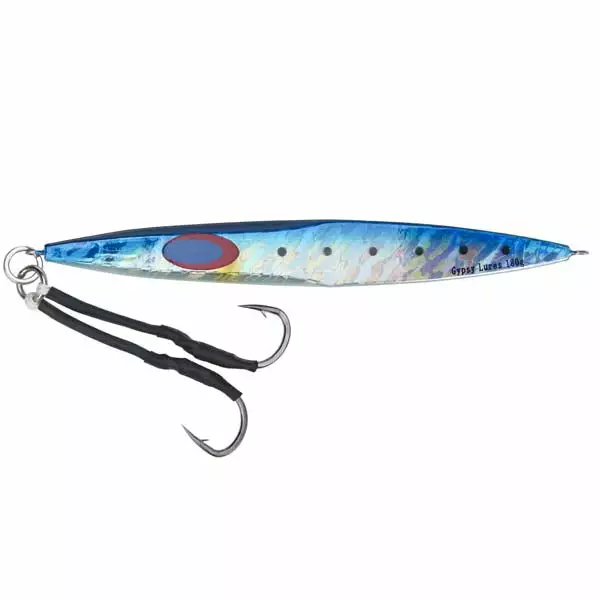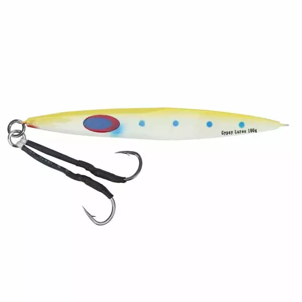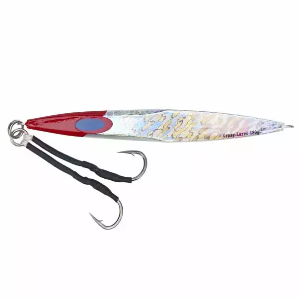 The 180G Gypsy Jigs are “UV” Coated for better visibility. Using this type of jig on a fast retrieve the jigs zigs and darts creating an erratic action of a frenzied batifish attempting to escape. Colors available: Chart/ Glow, Pink, Purple/Black, Red/Silver, Sardine.