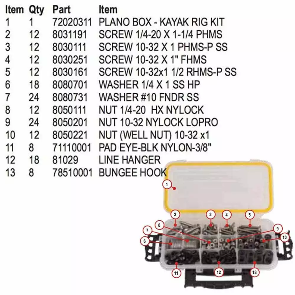 The Hobie Kayak Rigging Hardware Kit is a set of fasteners for rigging a kayak for fishing accessories. A custom selection of hardware chosen by the fishing experts all packed in a handy Plano box.