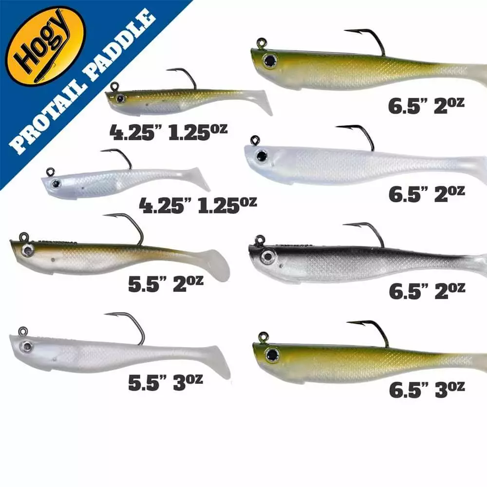 Prop 65 Warning CAThe Hogy 4.25″ 1.25 oz Pro Tail Paddle swim bait lure comes Pre-Rigged and was designed with big game inshore anglers in mind. Featuring a specialized blend of tough, yet flexible soft plastic, professionally molded around the VMC Barbarian Jig Hooks. UV infused soft plastic blend increases visibility in low light conditions.