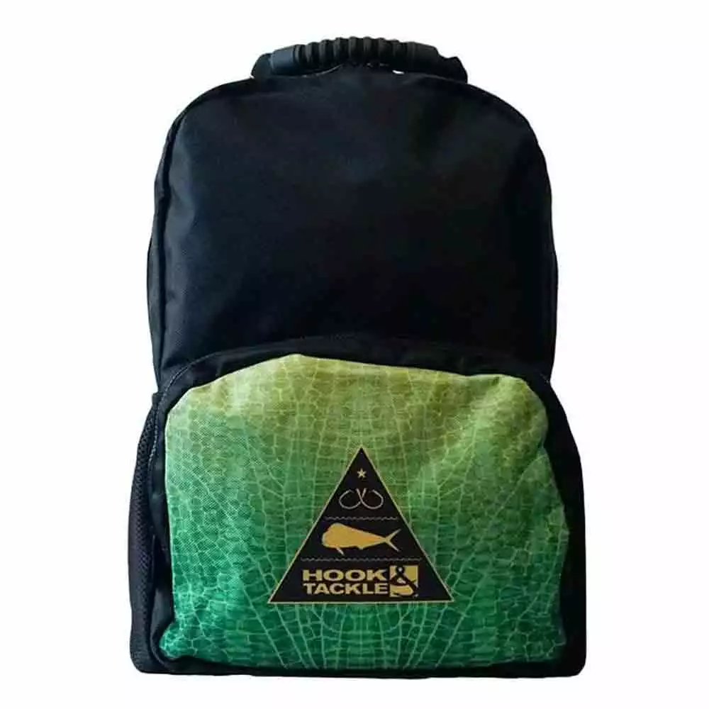 A mahi mahi skin pattern features appear on this one-of-a-kind Hook & Tackle fishing backpack. It boasts great compartments so you can stash gear quickly and hit the road or sea.