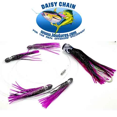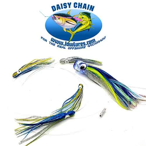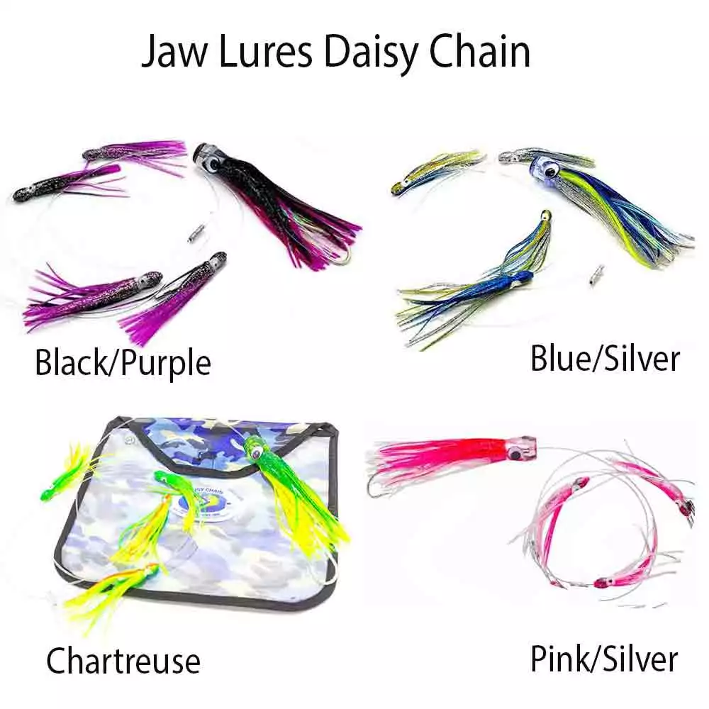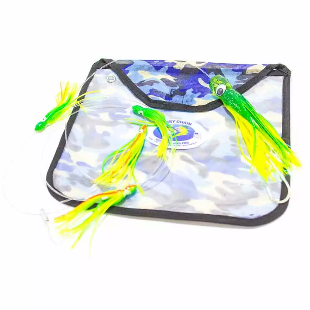 Prop 65 Warning CAJaw Lures Daisy Chains are hand made using slanted hard heads. This kit comes rigged with 200lb leader material,7/0 Mustad 3407SS-DT hook, and 4 Jaw squid skirts. Troll at 3 to 10 knots for Tuna, Mahi-Mahi,Sailfish, Wahoo and Marlin. Comes ready to use right out of the 10″ x 10″ Camo Mesh Bag.