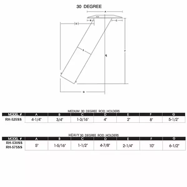 Prop 65 Warning CALEE-RH30 – Lee’s Flush Mount 30 Degree Rod Holders feature all stainless steel construction, lined with full length HD white vinyl insert. 2.5″ x 3″ rectangular flange. Available in Medium, RH-525 with a 2″ outer diameter and Heavy, RH-530 with a 2.25″ outer diameter.Lee’s 30 Degree Stainless Steel Flush Mount Rod Holder