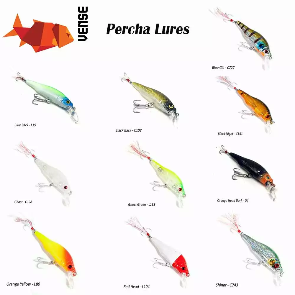 The Vense Percha Minnow Lures are a must have for your tackle box. Features bright colors, an internal rattling mechanism and VMC hooks.