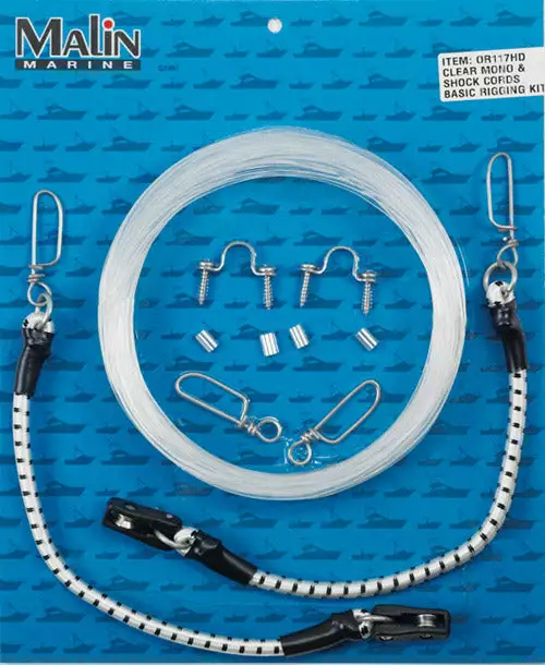 Prop 65 Warning CAMalin Clear Mono Complete Outrigger Kit. Kit is ready to rig, has heavy duty outrigger shock cords and pulleys, stainless steel mounting hardware, 120ft of 300lb mono in either clear or black, rigging hardware and rigging instructions.