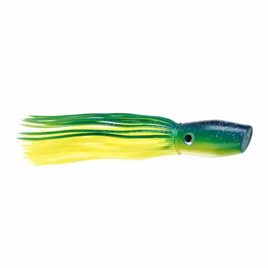 In a collaborative effort with Jim Lambert, owner of the 80 ft. Merritt Sport fishing yacht, Reel Tight, Capt. Eddie Herbert, professional crew, Eric, Joe, and Fly, and Mold Crafts design expert, Frank Johnson, a new and exciting Softhead lure is born. The Mold Craft Reel Tight Senior 1500RT Lure features a unique double taper, angle face that has outrageous action and throws an awesome wake. Its dynamic swimming action rivals nothing seen on the market today. Whether, weighted as a short teaser, or a non-weighted tracking trolling lure you will see lots of Marlin in your wake when you put this baby out! 12” length.