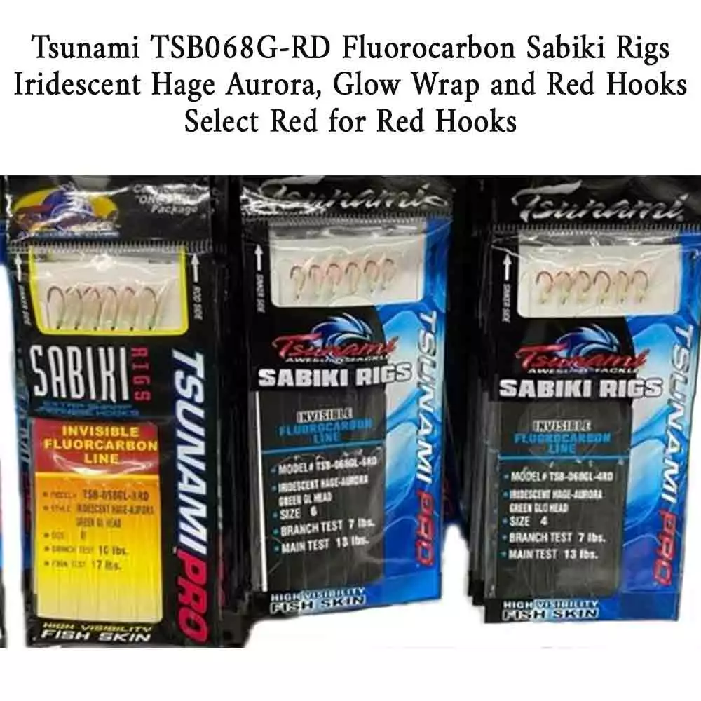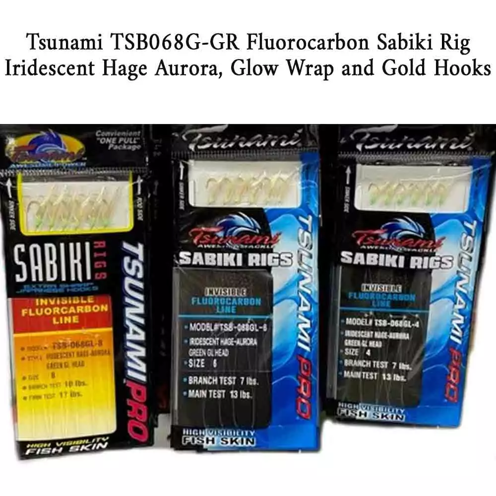 Tsunami TSB068G Glow Iridescent Hage Aurora Fluorocarbon Sabiki Rigs are easy to use and used by many bait fishermen. Attach your line to the swivel and lead to the snap and you are ready to catch bait. All rigs come with Iridescent Hage Aurora and a glo wrap.