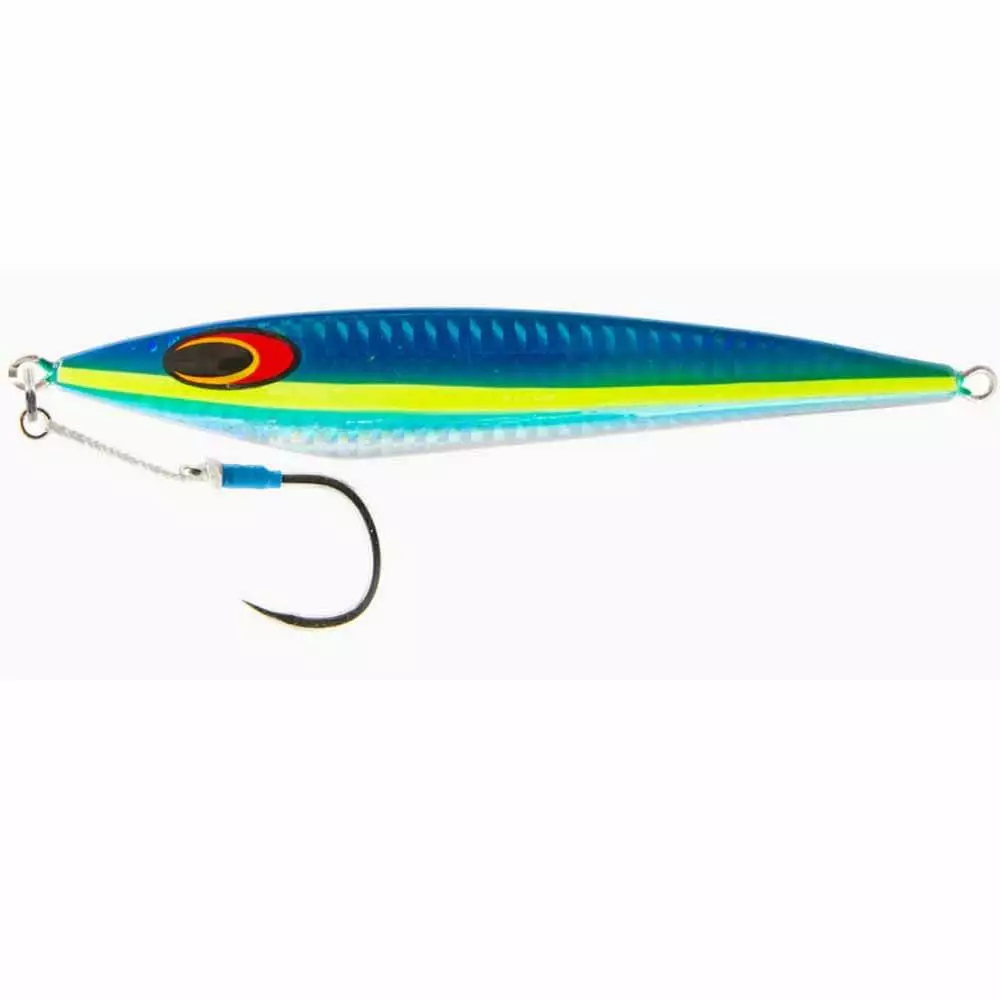 The unique shape and original design of the RIDGEBACK JIG creates an exciting new jig action. It can be worked as a slow pitch jig with a flick of the rod tip or worked fast as a high-speed jig. The unique angled head design creates an erratic sideways darting movement at the top of each lift of the rod, just give the rod a little flick at the top, and the ridgeback darts sideways and then flutters a little before falling again. When used slow it will flutter before starting to sink quickly, making it ideal for slow pitch jigging applications. Work it fast or slow and it will shoot off to the side giving an erratic action both pelagic and bottom feeding fish cannot resist.