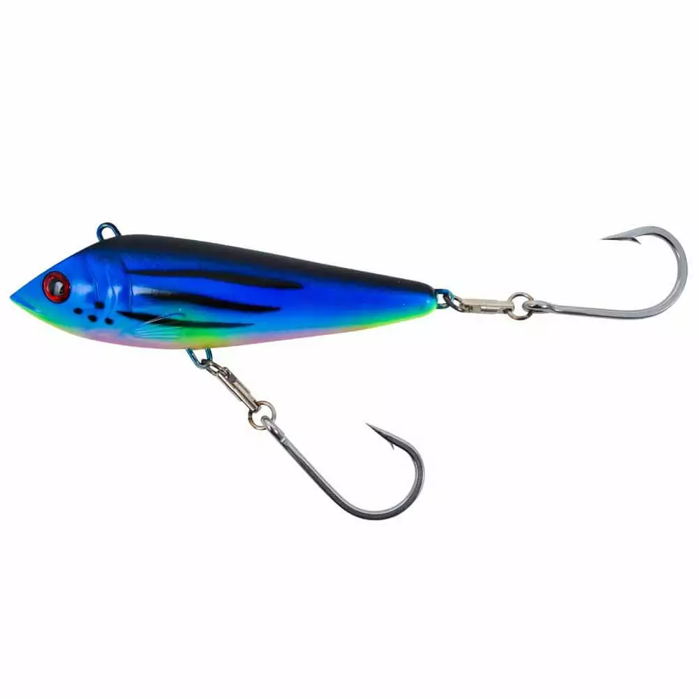 Prop 65 Warning CABraid Marauder Trolling Plug. A true tracking lure of choice for wahoo and tuna fishermen around the world. This lure can be pulled up to 12 knots. Has a vibrating action that drives fish wild and makes them bite! Has two swivel single hooks.