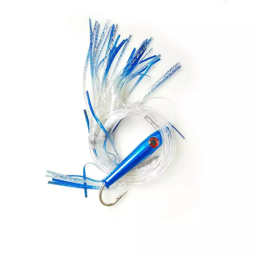 Daisy chain featuring our 2” stainless steel or Aluminum tuna stick with double hook, rigged on 15 feet of 125 lb mono with 5 squids. Great for blackfin tuna. Comes in a mesh wash-down bag.