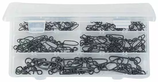 The Sea Striker Coastlock Snap Swivel Kit contains 60 of the best selling Billfisher coastlock snap swivels. Kit contains swivels with holding strength from 90-225 lbs. Both the brass swivel and the stainless steel snap have a non-reflective black finish. Comes in a handy reusable box containing: The quantity is 12 each of sizes: #5, #3, #1, 2/0 and 4/0 snap swivels. Billfisher CSK61 Coastlock Swivel Kit 60Pcs.