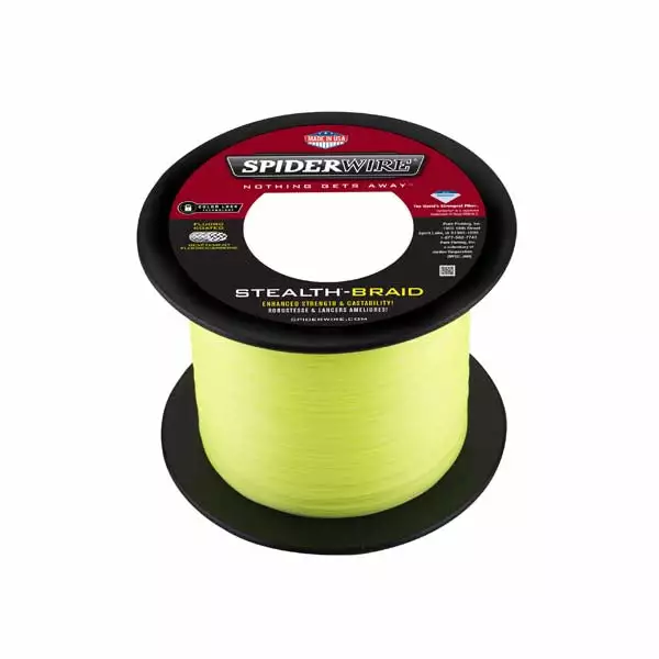 Prop 65 Warning CASpiderWire Stealth Braid 3000 yds Spools. SpiderWire Stealth® is made from Dyneema®, The World’s Strongest Fiber! Available in Moss Green for low-visibility underwater and Hi-Vis Yellow for visibility above water. Constructed to provide ultimate strength with the thinnest diameter for smooth and quiet performance. The no stretch properties of Dyneema PE fibers provides incredible sensitivity to instantly detect bites and structure.