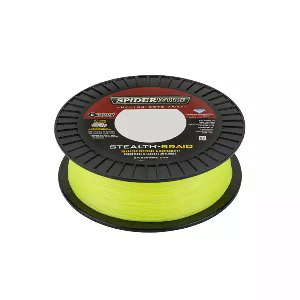 Prop 65 Warning CASpiderWire Stealth Braid 500 Yds. SpiderWire Stealth® is made from Dyneema®, The World’s Strongest Fiber! Available in Moss Green for low-visibility underwater and Hi-Vis Yellow for visibility above water. Constructed to provide ultimate strength with the thinnest diameter for smooth and quiet performance. The no stretch properties of Dyneema PE fibers provides incredible sensitivity to instantly detect bites and structure.