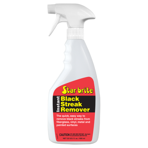 Prop 65 Warning CAStar Brite 22 Oz Instant Black Streak Remover. Black Streak Remover begins working on contact to eliminate black streaks under rubrails or anywhere else on the boat. In addition to being the best way to get rid of black streaks, this product is a great all-around cleaner for all marine surfaces and around the house. Ideal for use to remove black streaks or grime from fiberglass, metal, plastic, rubber, vinyl or painted surfaces. Quickly removes black streaks caused by water run off.