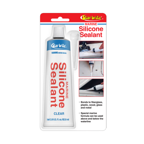 Prop 65 Warning CAStar Brite 28oz Silicone Sealant. Marine Silicone Sealant is true 100% marine grade silicone to provide a durable, waterproof seal that will not crack, shrink or turn yellow. Retains flexibility for excellent adhesion to fiberglass, wood, glass, metal and some plastics. It is easy to apply and equally easy to remove when desired. Bonds to fiberglass, wood, glass, metal and some plastics; can be used above and below the waterline.