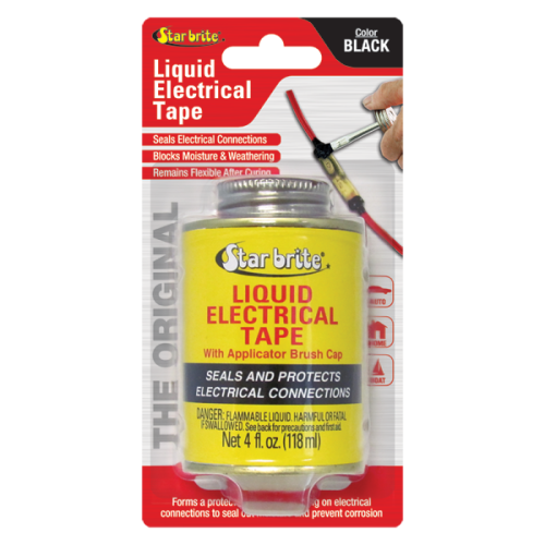 Prop 65 Warning CAStar Brite 4oz Liquid Electrical Tape Black. Liquid Electrical Tape (LET) is easy to use, providing an airtight, waterproof, dielectric coating in minutes. The coating will last for the life of the application, yet it can be removed immediately as needed. One application will protect terminal connections or splices, as well as guard against vibrations that can loosen connections. Star brite Liquid Tape is UL-tested, easy to use and reliable. Forms an airtight, protective, waterproof, UV resistant, dielectric coating. Prevents corrosion on wires and terminals, protects against vibration.
