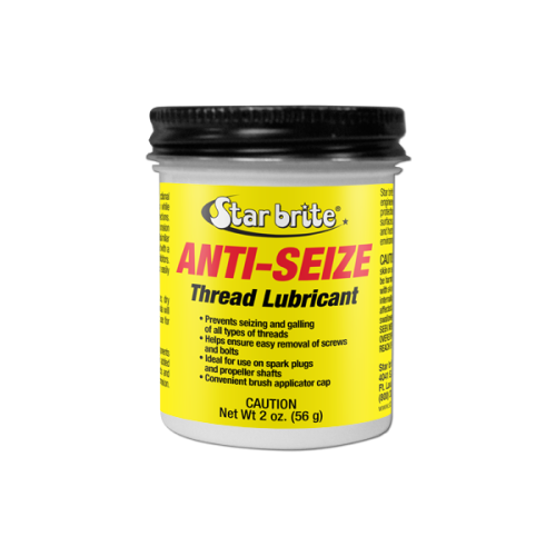 Prop 65 Warning CAStar Brite Antiseize Thread Lubricant. Star brite® Anti-Seize compound contains functional fillers that form a barrier against corrosion while preventing seizing and galling of threaded connections. The non-metallic fillers guard against galvanic corrosion by forming an insulating barrier between dissimilar metals. The proprietary grease base is formulated with a very high concentration of premium corrosion inhibitors. The smooth texture allows the compound to be easily applied on both large and small assemblies. Prevents seizing and galling of all types of threads. Makes removal of screws and bolts quick and easy. Great for spark plugs and propeller shafts. Brush applicator cap. Directions:Coat clean, dry threads or components with the compound and then assemble. For added protection, apply to bolt heads, exposed threads and other surfaces that need to be protected from corrosion. Keep container sealed when not in use.