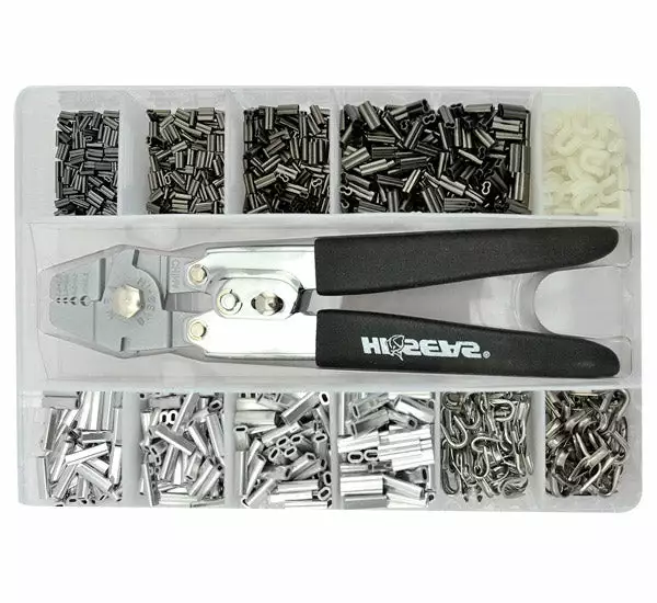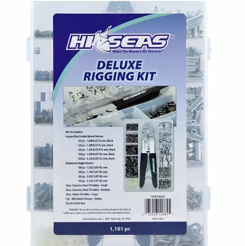 Prop 65 Warning CAHi-Seas Deluxe Rigging Kit contains – Copper Mini Barrel Double Sleeves: 125 each – 1.0ID Black, 1.3ID Black, 100 each – 1.6ID Black, 1.9ID Black, 2.2ID Black; Aluminum Single Sleeves: 100 each – 1.5ID, 1.7ID, 2.0ID, 2.3ID; Stainless Steel Thimbles 50 each – Small, Medium; Nylon Thimbles 50 each – Large; Mini Deluxe Hand Crimper and Sturdy Tackle Box.