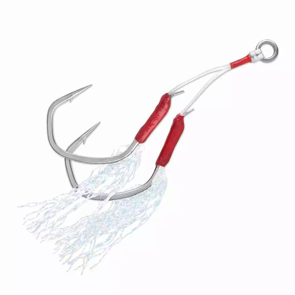 Ready to use VMC Techset Tandem Assist 7117 TIN Rigs 2-hook assist rig for slow pitch jigging. Extremely sharp points for easy penetration, essential for slow jigging when hits occur as the jig is falling. Technical locking curve reduces chances of the hook opening up when hooked on to big fish. Featuring assist line with fluorocarbon core to minimize tangling. UV Krystal Flash for maximum visibility optimizing the strike rate.