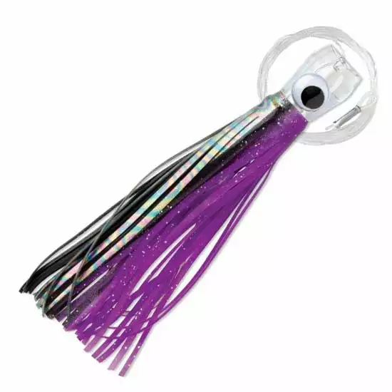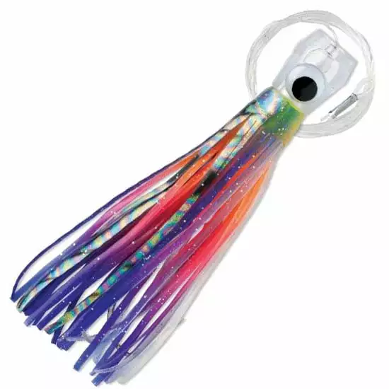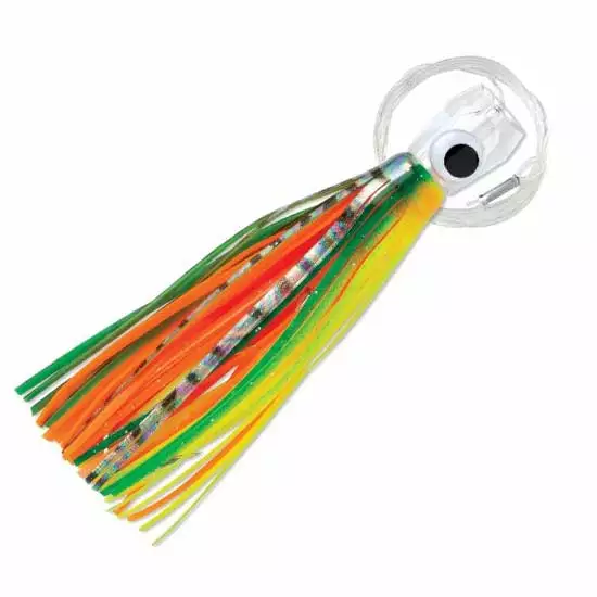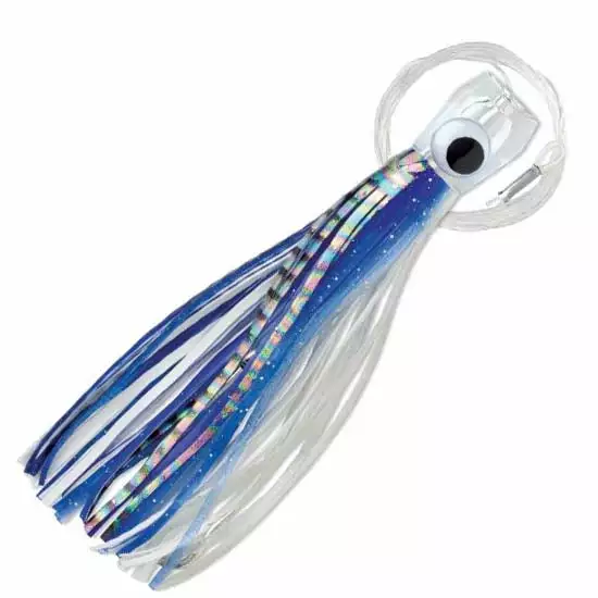 Willamson Rigged Sailfish Catcher Lure. This concave pusher design is a great little lure to use in conjunction with a strip bait or Ballyhoo. Features rear Ballyhoo rigging spring cavity and comes pre-rigged with 5ft of 130lb Sufix mono leader and a VMC 8/0 hook.