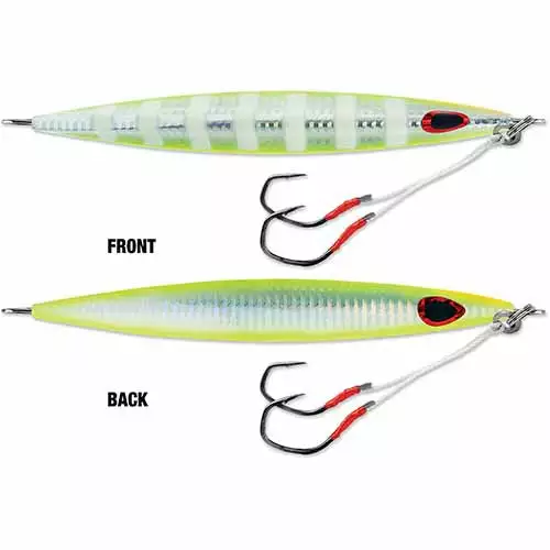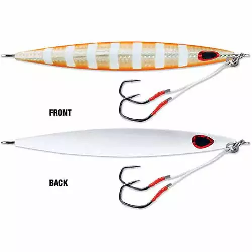 The Williamson 280G Kensaki Slow Pitch Jig is asymmetrical and cuts water fast with its knife-tip design, allowing it to get deep. The “in line“ eyelets stabilize the jig during descent and enhance the fluttering action under slack line. Use a ‘lift & fall’ slow-pitch technique to get the Kensaki darting aggressively upwards during the lift, followed by a very tight horizontal flutter on the fall.